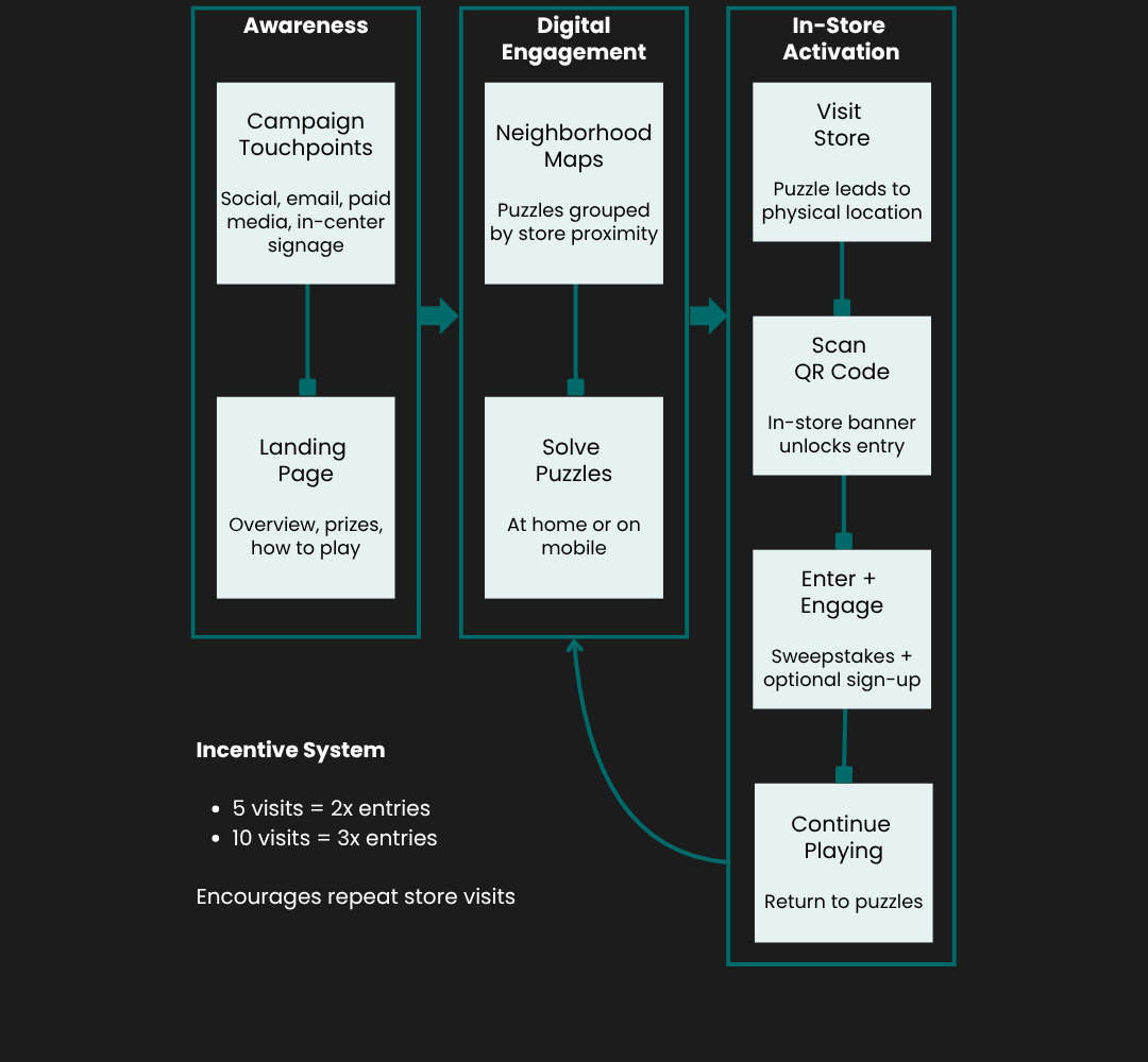 Customers solved online puzzles to identify participating retailers. Once completed, they visited stores to scan QR codes and unlock sweepstakes entries—making physical store visits essential to participation.