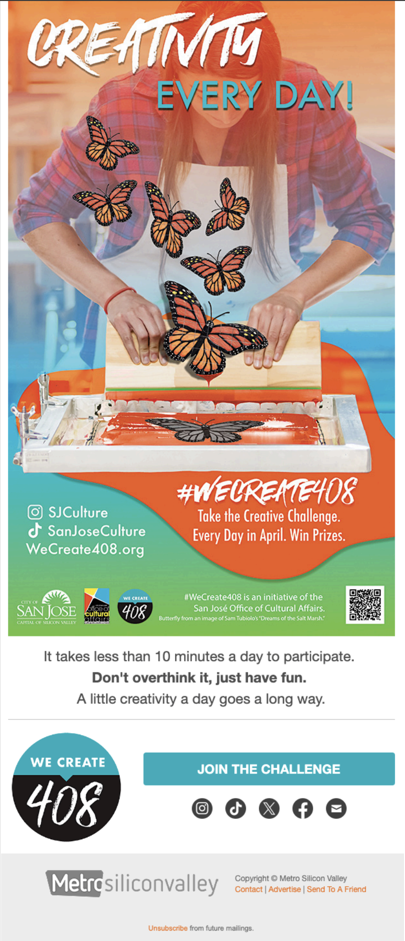 WeCreate408 is a month-long initiative designed to encourage San Jose residents to engage in creative expression during California Arts, Culture, and Creativity Month. The campaign needed to increase awareness, drive sign-ups, and make participation accessible to a broad and diverse audience.