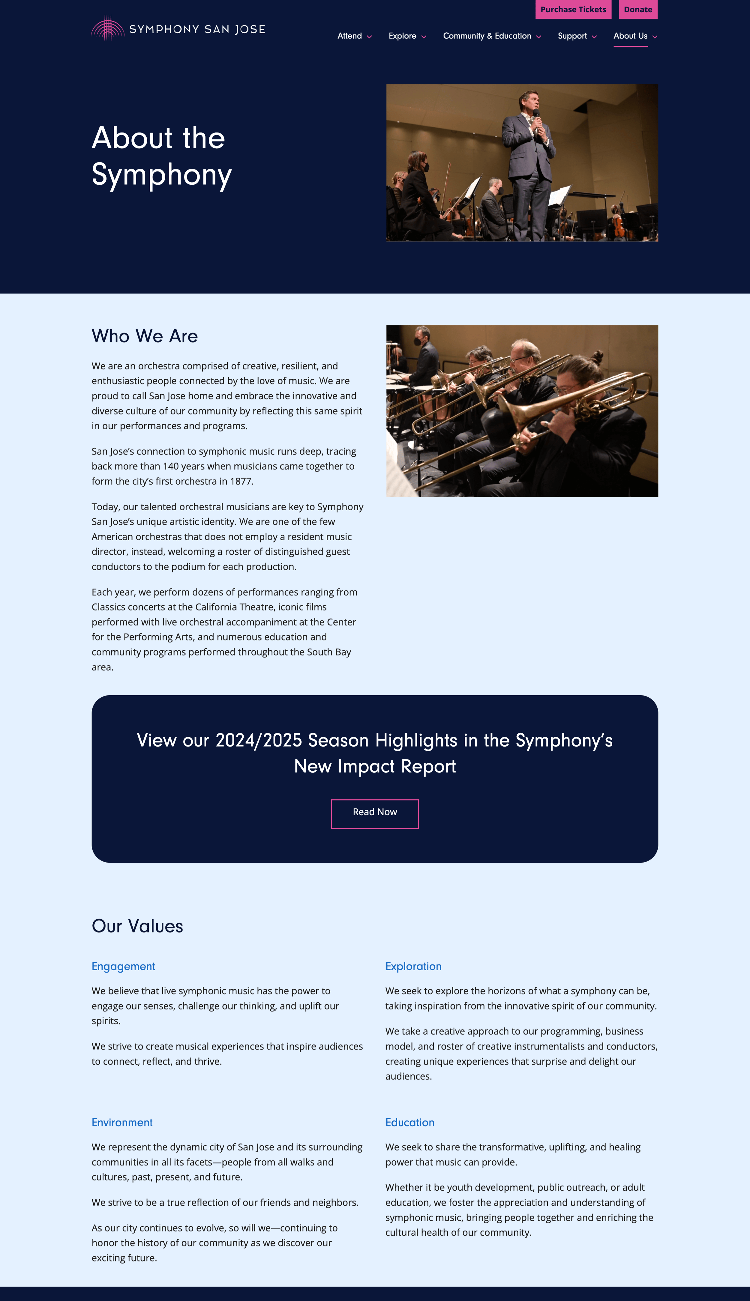 Consolidated and streamlined website content to improve information architecture and overall user experience, ensuring all messaging reflected the symphony’s core values: engagement, exploration, environment, education, and equity.